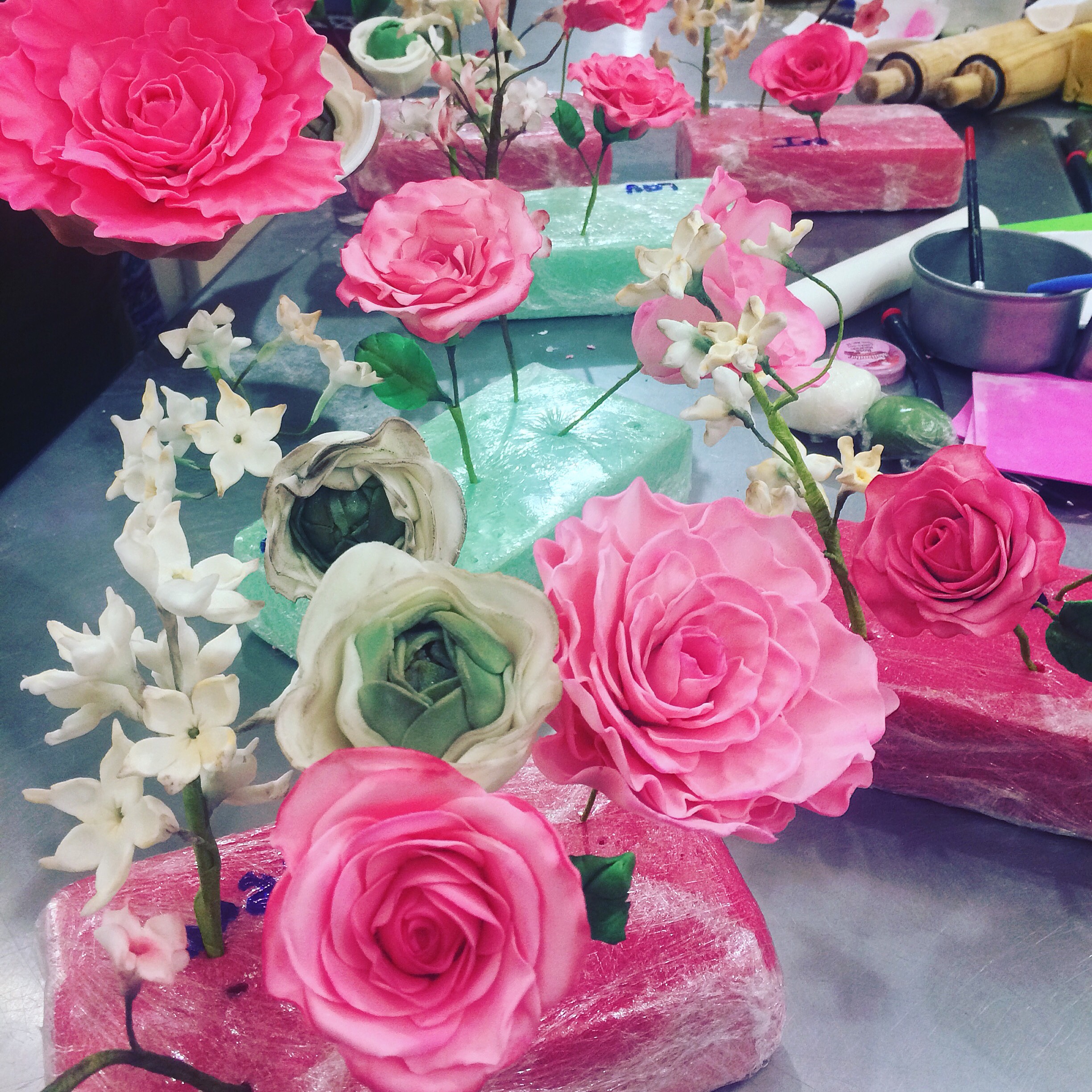 ¿Qué flores enseñaremos? Es un curso que se divide en dos días. El primero vemos jazmines, hortencias y cerezos. Al siguiente día haremos rosas, peonias y ranúnculos. Haremos la pasta de goma, las flores y el matizado de las flores para darles un toque más realista.